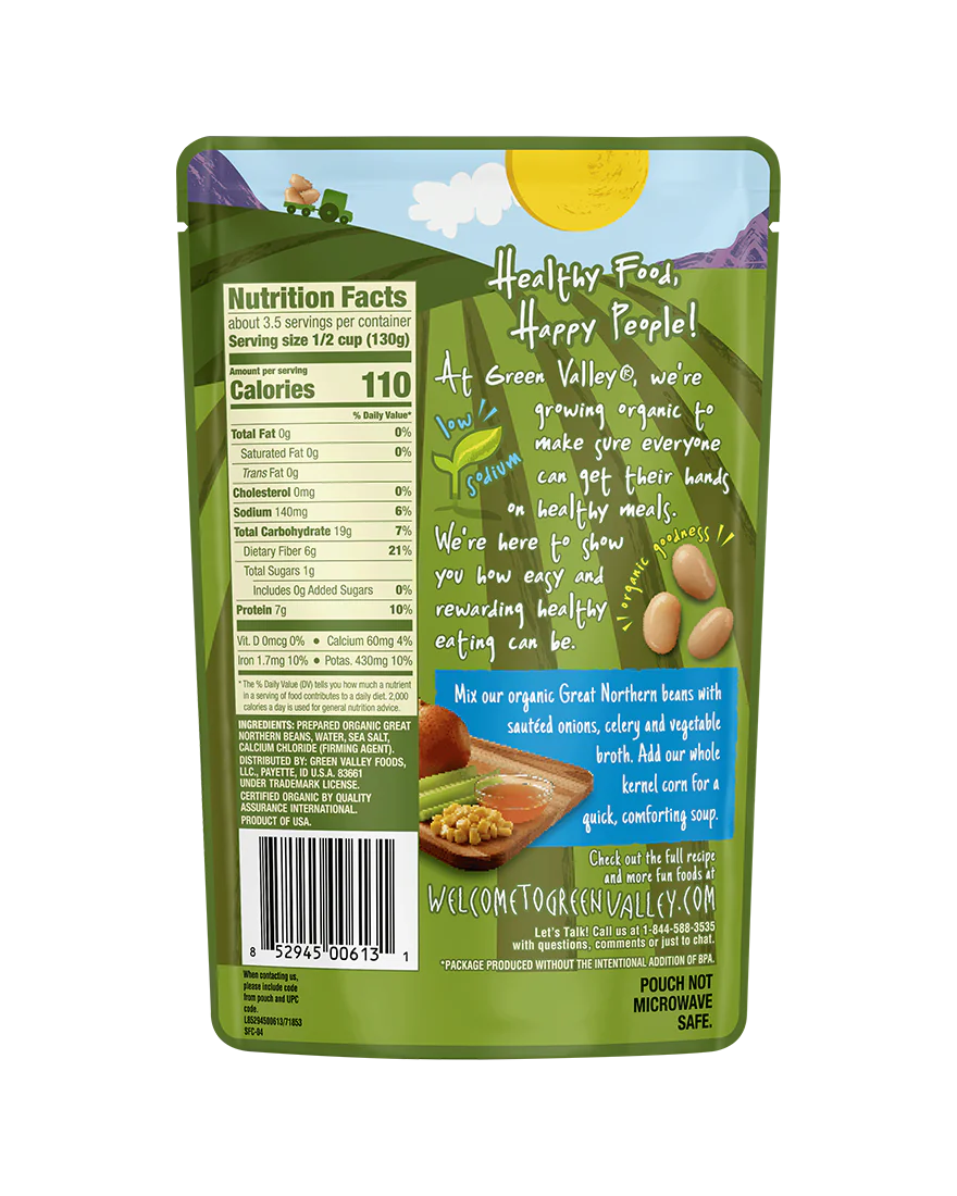 What is so “great” about these beans, you ask? Everything! Green Valley Organic Great Northern Beans are grown using modern organic farming techniques on family-owned farms in the U.S., this allows us to create the finest food ingredients for you and your family. Their tender, creamy texture and mild nutty flavor make them a great choice for soups, stews, casseroles and even salads. In the mood for Creamy Great Northern Bean Soup with Bacon or Avocado & Great Northern Bean Salad? Try both!